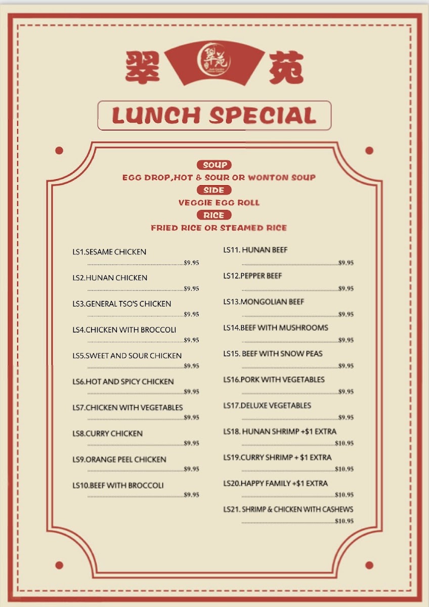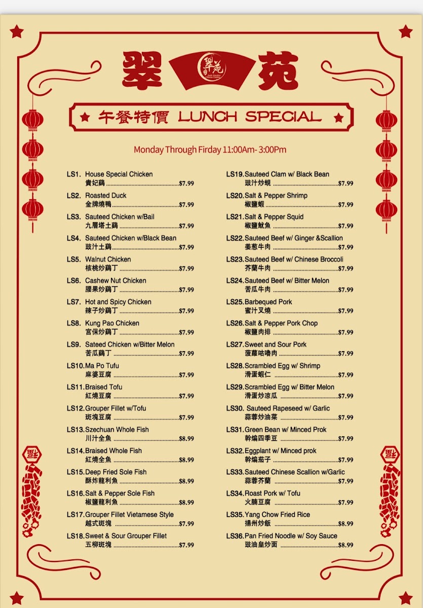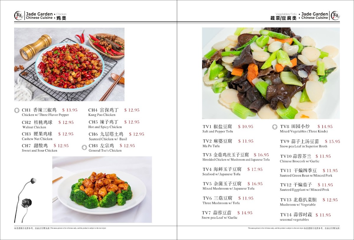 At Jade Garden Chinese Cuisine, you're in for a treat with a diverse menu that celebrates the rich flavors of authentic Chinese cooking. Whether you're craving something savory, spicy, or sweet, this menu has something for everyone. From classic dishes like crispy General Tso’s chicken to flavorful stir-fried vegetables and delicate dim sum, every item is crafted with fresh ingredients and bold seasonings that transport your taste buds straight to China. For a satisfying meal, try their house specialties, like the aromatic Peking duck or the tender Mongolian beef. If you're in the mood for something lighter, their soups and salads offer a refreshing start to your meal. Jade Garden Chinese Cuisine Menu features a variety of options that will leave you coming back for more, no matter what you're in the mood for. Whether dining in or ordering out, you're guaranteed a satisfying experience with every bite.